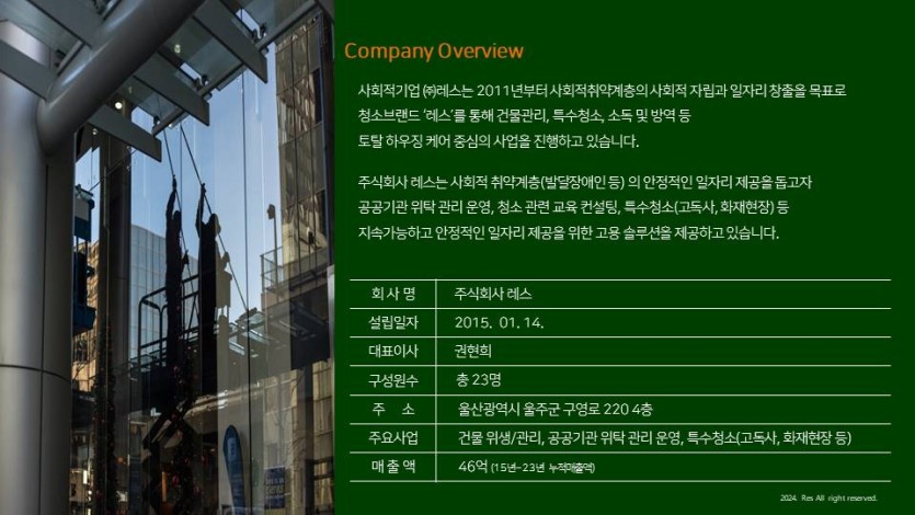주식회사 레스는 2011년부터 사회적취약계층의 사회적 자립과 일자리 창출을 목표로